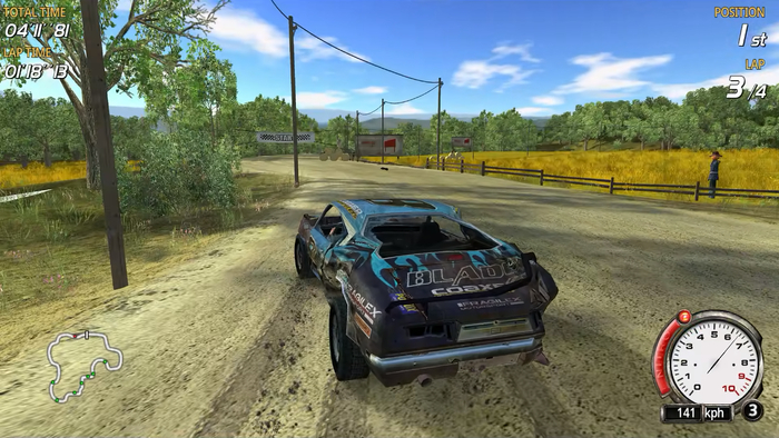 Кстати о других элементах. Я очень люблю игровые уровни - карты, локации, трассы. В общем всё то, где мы, как игроки, ориентируемся в пространстве. В гоночных играх трассы это буквально самая важная вещь (наряду с физикой, конечно же, ведь они работают в тандеме, дополняя друг друга), поэтому у меня не было бы такой любви к FlatOut, если бы трассы здесь были хотя бы средненькими. Нет, они здесь потрясающие! У каждой есть своя изюминка, какой-то свой уникальный хитрый поворот или каверзно поставленный срез, своя неповторимая эстетика геометрии. Для успеха в заезде трассу нужно заучить, она должна стать родной, должна стать любимой. Тем не менее, с годами и каждым новым перепрохождением игры я всё ещё продолжаю находить какие-то новые интересности и придумывать какие-то хитрые тактики - вот тут можно бесплатно обзавестись нитро, протаранив шины без потери скорости, а вот этот конус почему-то слишком тяжелый для своего вида и о него при желании получится остановить притершегося соперника. А ещё у трасс потрясающий арт-дизайн! Это, конечно, не уровень следующей части, где разработчики очень умело поиграли со светом, но всё равно - смотреть на местные леса и бесконечные стройки не надоедает, а даже наоборот, чувствуешь какую-то реальность происходящего. Ещё FlatOut одна из немногих гоночных игр, где кампания целиком состоит из уникальных заездов, тут нет перепрохождений одной трассы на другом классе авто просто потому что, хотя в рамках отдельного заезда никто не запрещает взять более позднюю машину на раннюю карту.