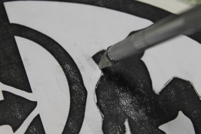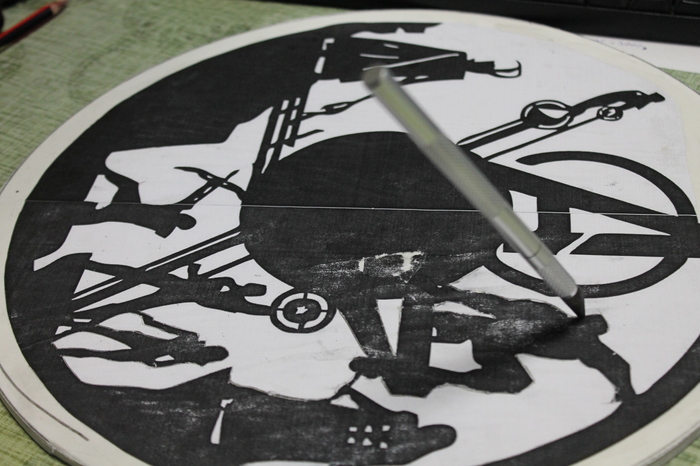 Нашел лист вспененного ПВХ и наклеил на него распечатанную картинку. Купил макетный нож(скальпель) и принялся резать пальцы, скатерть и (криво-косо) пвх по шаблону.