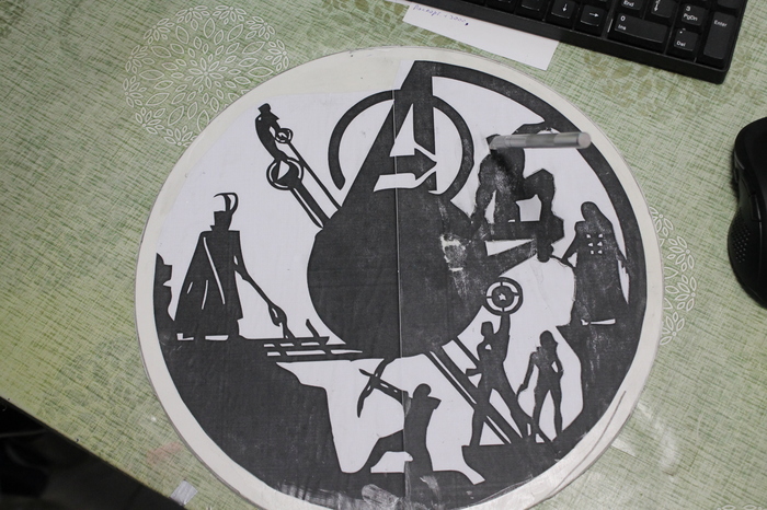 Долго ли, коротко ли(3 дня в перерывах на работе), я резал этот шаблон, отшлифовал немого края и благополучно уронил на кафель почти готовый макет. вдребезги. Сокол остался без руки и лука, локи без рогов, а Тони совсем оторвался от команды. Выручил цианакрилат. Легко заклеил всё клеем и слезами, покрасил повторно, добавил лампочек из воздушного шара(ниже пример) и часовой механизм из фикспрайса.