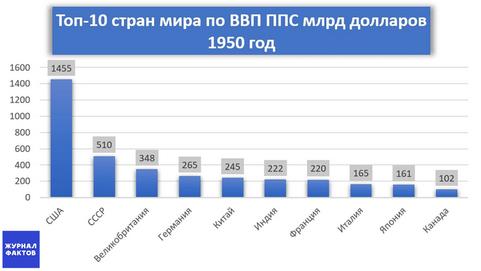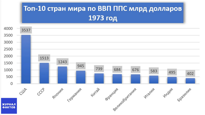 Вы увидите, как развивалась экономика СССР, начиная с 1950 по 1990 гг. Конечно же, в 1950 году СССР под руководством Сталина только восстановился от последствий войны и начал свой путь к покорению космоса и построению мощнейшей экономики. Видно, что к 1973 году экономика СССР утроилась, но по объемам отставала от американской. К сожалению, к 1990 году разрыв только усилился и СССР обогнали такие страны, как Япония и Китай. В настоящее время, российская экономика входит в пятерку крупнейших экономик мира с объёмом около 5 трлн долларов США.