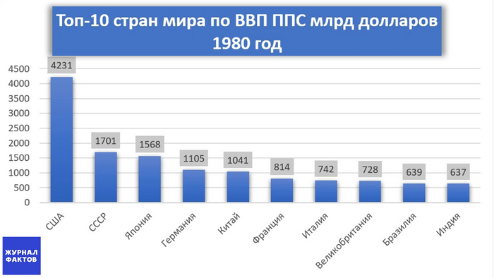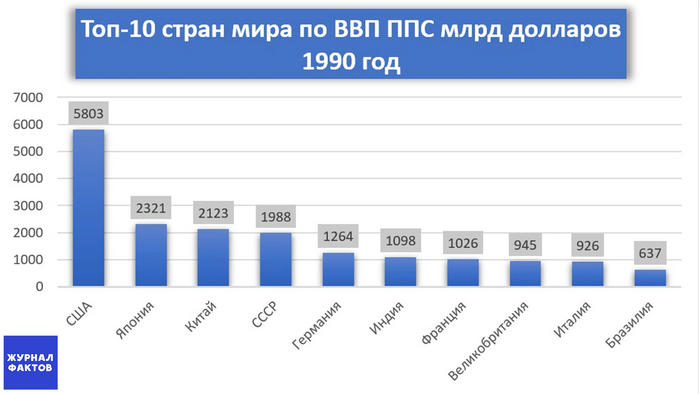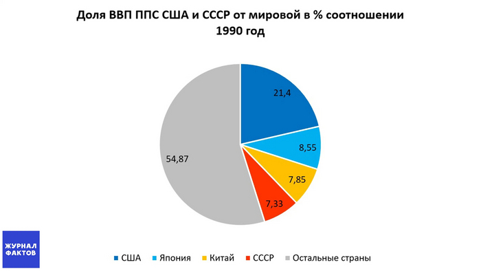 Сегодня, мы попробуем посмотреть на Советский Союз, как на экономику и покажем вам место СССР в мировой экономике времён его существования. Сравним Валовой Внутренний Продукт по паритету покупательской способности в долларах США (ВВП ПСС). Благодаря такому исследованию, вы увидите реальный размер экономики СССР в американской валюте, а не по обменному курсу. И да, напомним, что в расчёт мы возьмём курс доллара США на 1990 год.