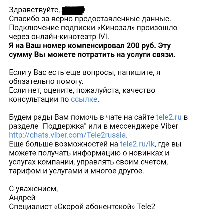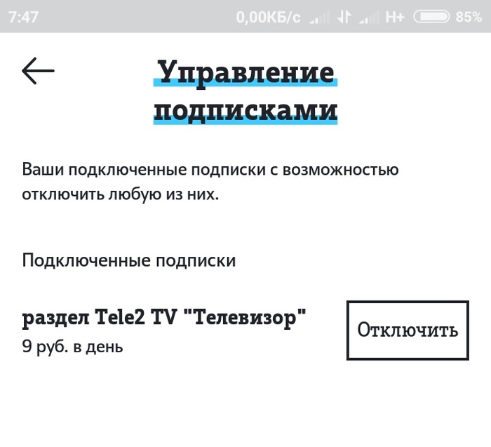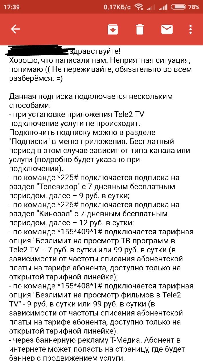 Отключаю и пишу сообщение в тех поддержку следующего содержания:" Добрый день. Около 2-х недель назад пришло сообщение "Вам доступно 7 дней бесплатного просмотра телеканалов в приложении Tele2 TV. По истечении 7 дней начнет списываться абонентская плата за доступ к разделу “Телевизор” - 9 рублей в сутки. Отключить подписку можно в мобильном приложении Tele2 TV. Начать просмотр ТВ-каналов можно, установив приложение Tele2 TV по ссылке: http://tv.tele2.ru/9"