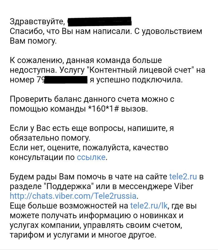 Но, перед этим, решил уточнить у службы поддержки данный вопрос. Написал примерно следующее: "День добрый, можно ли подключить услугу "контентный счет" без посещения салона связи? Команда *160# не работает".