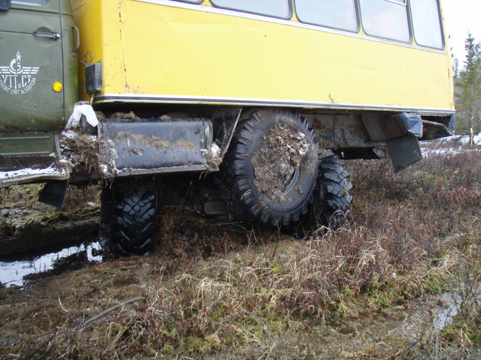На его счастье, мимо проезжали геофизики, мужики внешне суровые и злобные от вынужденной трезвости, но внутри невероятно отзывчивые:) Вытащили. Правда, болото затянуло настолько, что при вытаскивании оторвали третий мост и рама лопнула. Под списание.