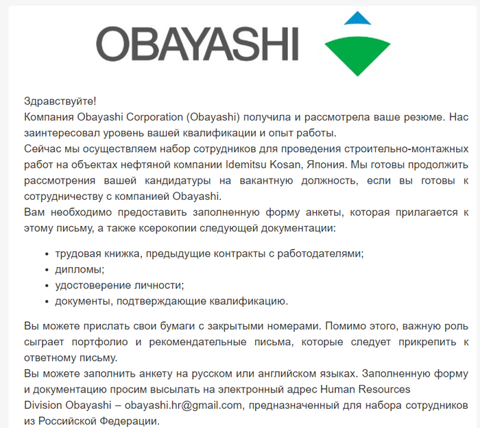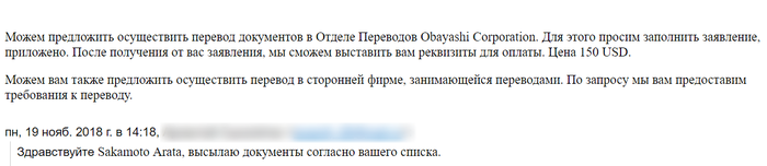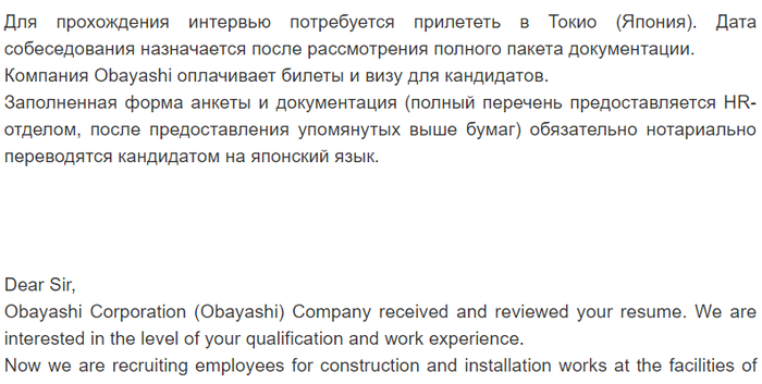 Ну понятно все, думаю. Но сомнения таки есть, так как занимаюсь строительством, пробил контору в интернете, действительно есть такая и занимается строительством в Японии. Спросил у них откуда взяли резюме мое изначально, говорят что нанимают рекрутинговые агенства, в том числе и из России. В письмах есть телефон и имя/фамилия того кто пишет, но т.к. японским нихера не владею не могу позвонить ни ему, ни в центральный офис компании. Попросил прислать требования к переводу и сказал что сам буду переводить. Требования прислали, в Московском бюро переводов, с такими требованиями, перевод стоит 25000р. Вот меня и мучает вопрос, что за развод такой специфический... или не развод...
