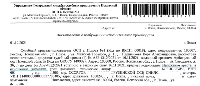 После двухнедельного раздумья, 01.12.2021 г. судебный пристав-исполнитель ОСП № 1 по городу Псков вынесла Постановление о возбуждении исполнительного производства согласно которого аресту подвергалось не имущество ответчика, а сам ответчик-должник, как физическое лицо !
