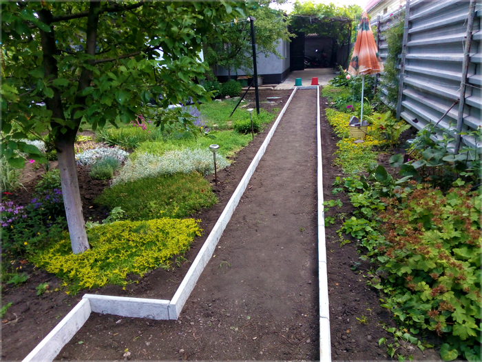 В центре дорожки грунт не затрагивался вообще и поэтому являлся хорошей основой, а вот вдоль бордюра приходилось хорошенько утрамбовывать.