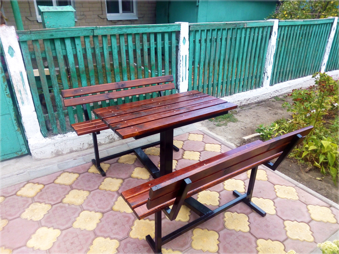 После прочтения первого поста многие заинтересовались назначением обрезка трубы, который был оставлен для крепления будущего стола с лавками. Как и обещал, показываю, что и итоге получилось. Рассматривались разные варианты конструкции, но мы остановились на таком: