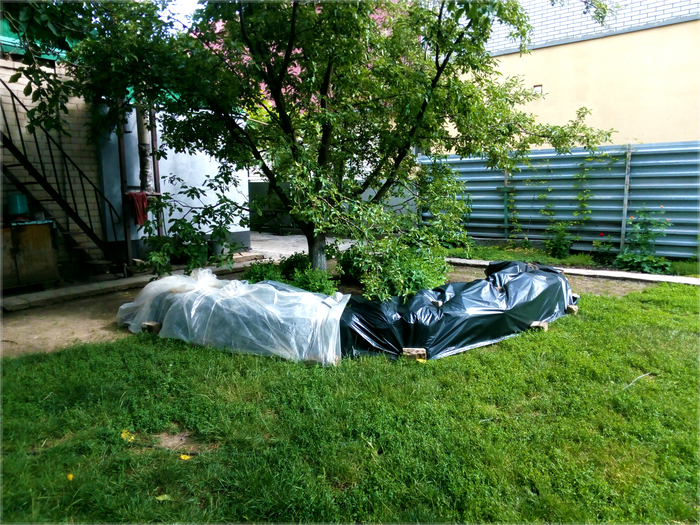 Песок, доставленный в мешках по 50 кг, на время работ был надёжно спрятан от дождя :)