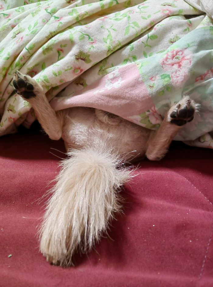 Спать любит на нашей кровати, при чем залезает под одеяло, оставив снаружи жопу.