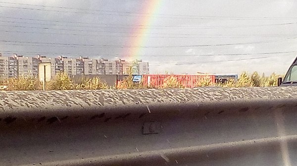 Когда я был маленький в разных "научных" книжках для детей писали, что у радуги нет начала и конца, и что она круг в небе! Но... Сегодня я ехал по питерскому КАД и увидел это: