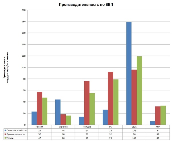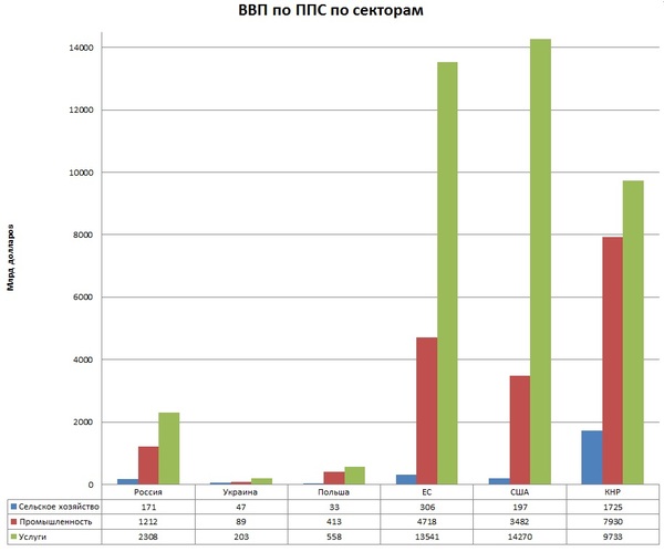 Первая диаграмма показывает распределение ВВП по ППС по секторам экономики. Вторая показывает некую производительность по секторам в расчёте миллиардов долларов по ППС делённых на 1 млн занятых в данном сектор экономики (простите меня экономисты за такой странный показатель). В целом достаточно занятные данные, может кому и пригодятся в школе, универе или ругани в комментах.
