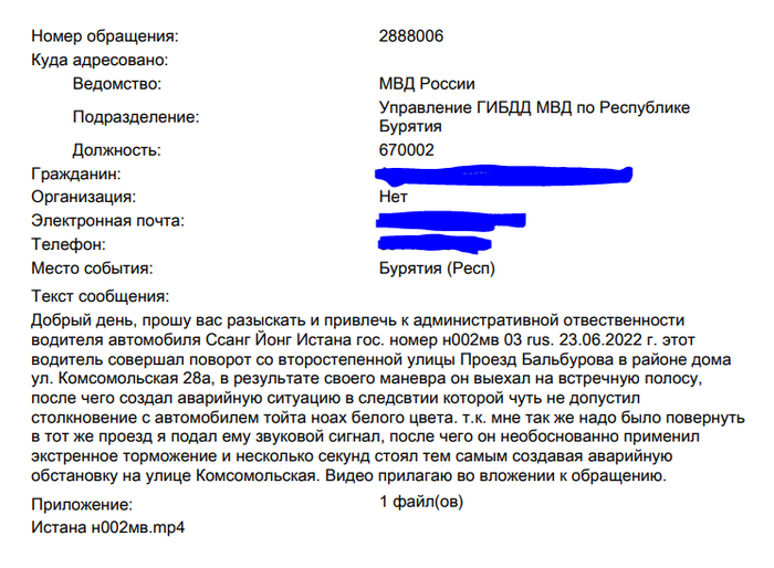 После этого через несколько дней вам позвонит инспектор и попросит вас приехать если вы указали не все данные и дать объяснииельную. На моем опыте это произошло на 4е обращение, на мой взгляд они это делают что бы зебать вас, что бы вы не писали больше обращений. Я стараюсь устно договориться с инспектором и уточнить что именно не хватает. Недавно я подавал обращение и забыл указать время проишествия, я сказал инспектору что на видео есть вотемарк с временем и датой, он попросил скинуть его на вайбер и продиктовал номер. Я сразу же переслал. С другим инспектором у нас сложились более теплые отношения и сразу после написания заявления, я отправлял ему на почту видео. Тем самым экономя мне и ему время.