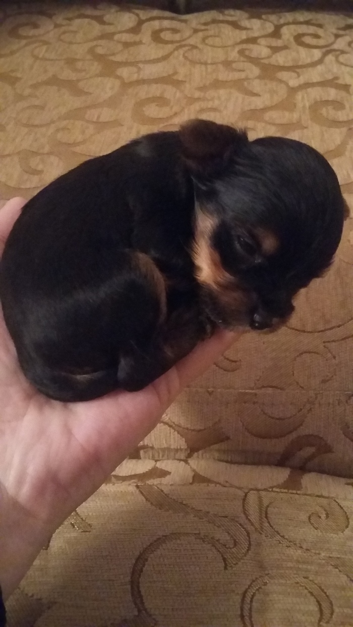 Пока был на работе, пробник собаки был доставлен в дом. Приехал, увидел и ... Теперь он живет у нас. Это милое создание размером с мою ладонь. Он месяц от роду. Ясно, что рано, но заводчица уверила жену, что сложностей особых не будет, и мы справимся. Справляемся. Сделаны первые шаги. Теперь уже смелее, шатаясь, наше чудо изучает дом. Пока только по запаху, так как видеть он начнет позднее.