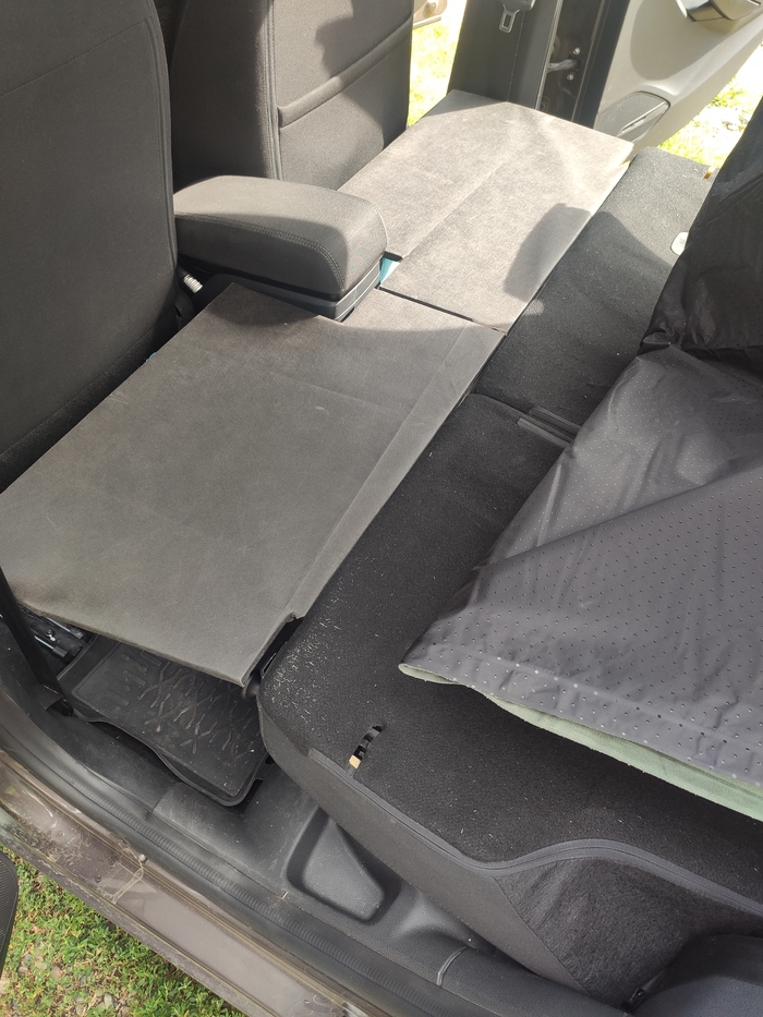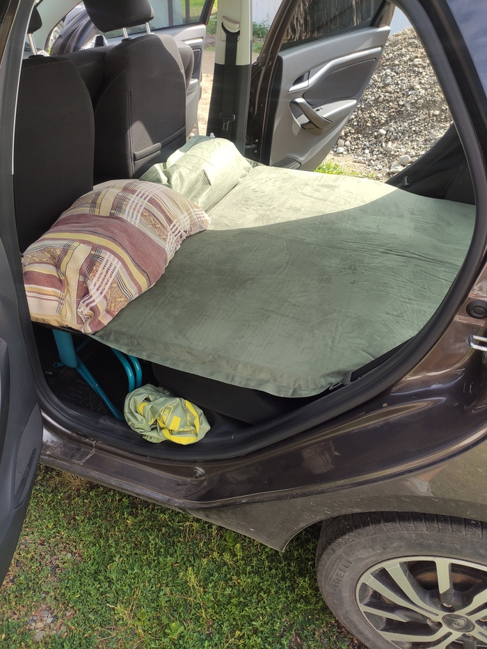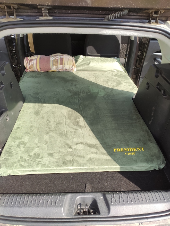 На маркетплейсе был куплен самонадувающийся коврик под изгибы салона. К сожалению они универсальные и немного не хватает длины. Но я с ростом 171см не достаю ногами до того места где его нет. Так что мне норм. И кстати из за этой складной фанерки жопа находится в широком месте салона, что позволило спать втроём. Я, жена и ребенок 10 лет. И не скажу что было тесно. Я ожидал что будет хуже.