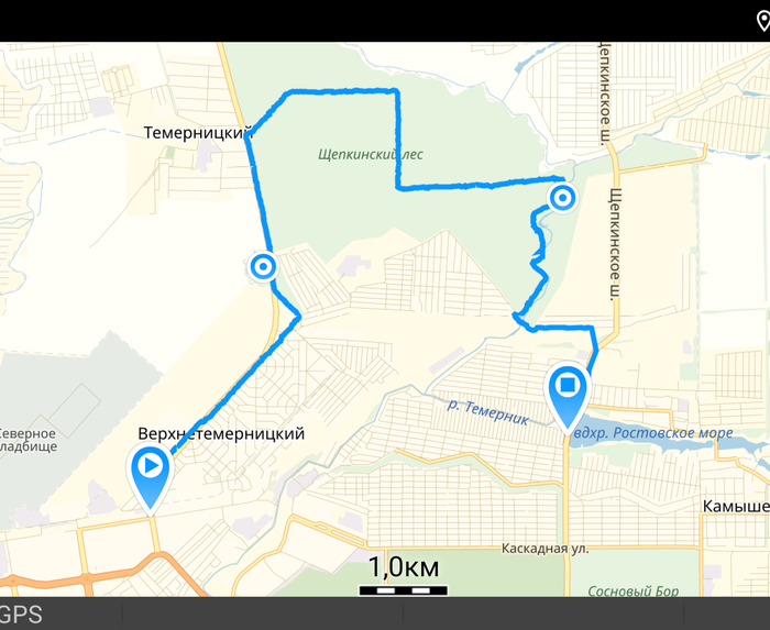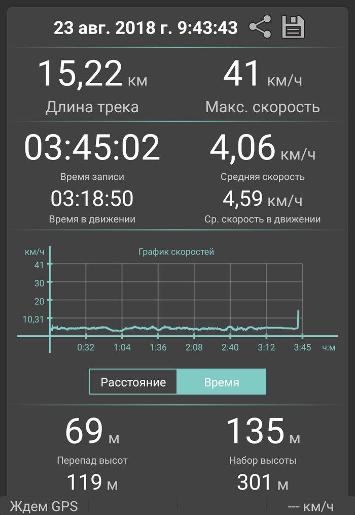 На привале я ставил запись трека на паузу, так что там вышло не пять с половиной часов, а все 8-9. Точки на треке - места остановок.