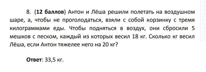 Я оставлю на совести составителей заданий их уверенность в том, что 5-ти классникам известны принципы воздухоплавания (закон Паскаля и закон Архимеда), но каково же было моё удивление, когда в белых задачах MathCat - 2019, конкретно в 8 задаче я увидел такой ответ: