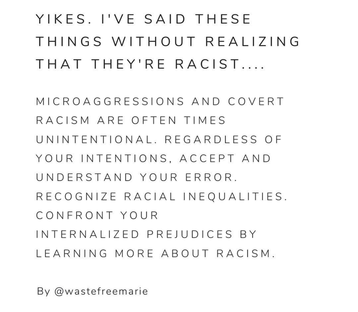 Когда люди увековечивают расизм, это обычно непреднамеренно. у вас могли быть благие намерения. Тем не менее, расистские действия определяются их воздействием, а не их намерением. Дайте черным людям преимущество сомнения, когда мы призываем к расизму. Вместо того, чтобы предполагать, что нам не хватает понимания или интеллекта, выслушайте и узнайте у нас о том, как противостоять расистским идеологиям."