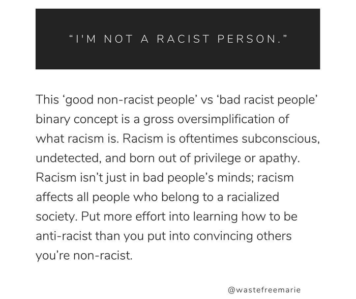 Бинарная концепция «хороших нерасистских людей» и «плохих расистских людей» является грубым упрощением того, что такое расизм. Расизм часто бывает подсознательным, незамеченным и порожденным привилегиями или апатией. Расизм не только в умах плохих людей; расизм затрагивает всех людей, принадлежащих к расовому обществу. Приложите больше усилий к тому, чтобы научиться быть антирасистом, чем к тому, чтобы убедить других, что вы не расист"