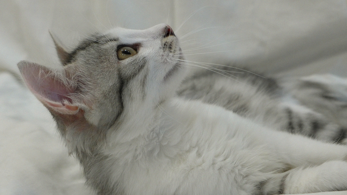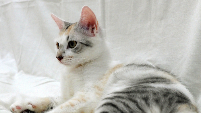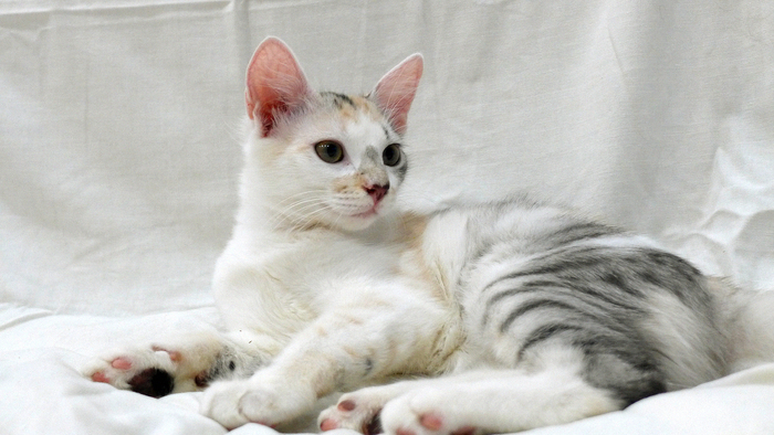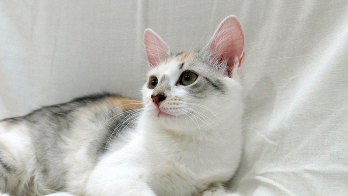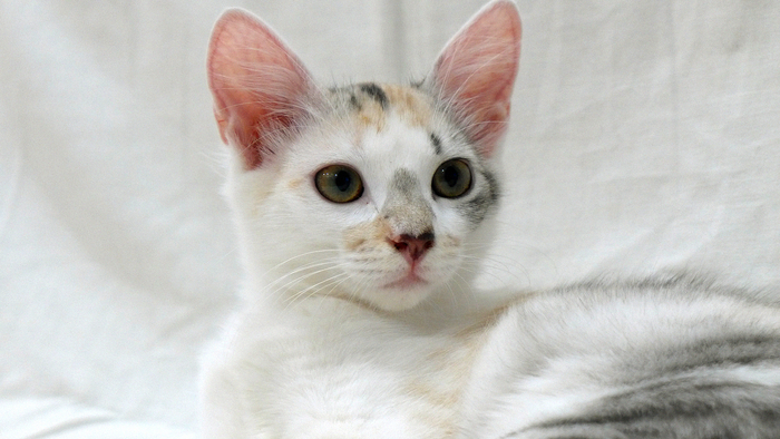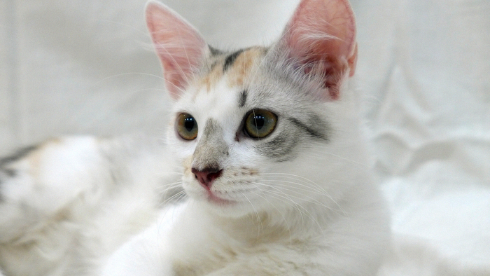 Эта красавица как произведение искусства, её шерсть похожа на картину талантливого художника - элегантные мазки на белом холсте. У неё средней длинны шерсть, стройное тело, трёхцветный окрас (белый, серый, рыжий), красивые зелёные глаза и длинный пушистый хвост. Котёнок для своего возраста (четыре с половиной месяца на момент публикации) довольно крупный, хотя молочные зубы всё ещё не сменила.