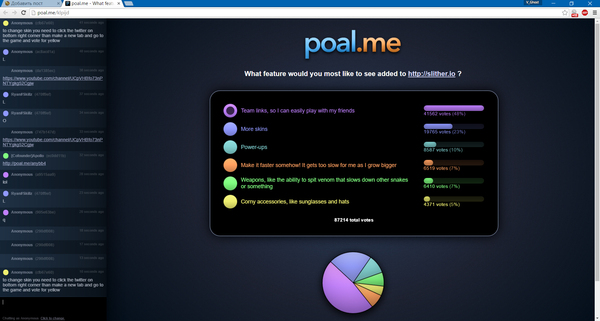 Так же есть голосования, что бы игроки хотели видеть в след. обновлении. Если верить голосованию, то в следующем обновлении будет возможность играть с друзьями, а позже - больше скинов. Так же есть чатик, можно "повыгонять" инностранцев, заполнив русским текстом)