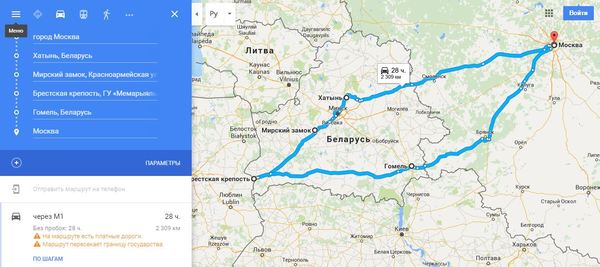 Итак, сам маршрут: Москва - Смоленск - Минск - Мирский замок - Несвижский замок - Коссово - Брест - Беловежская Пуща - Гродно - Лида - Минск - Хатынь - Витебск - Москва