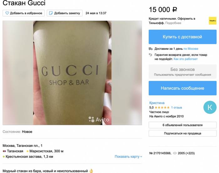 В конце мая в Москве в честь столетия бренда открылись поп-ап-ресторан, кафе и бутик Gucci . Два заведения модного Дома появились на месте ресторана Margarita Bistro и «ЗОЖ-кафе» 42 Coffeeshop на Патриарших прудах. Планировалось, что проработают они всего месяц до 21 июня. Кафе Gucci shop & bar быстро стало одним из популярных московских заведений. Брендированные стаканчики (даже использованные) начали продавать на Avito. Цена достигает 15 тысяч рублей.