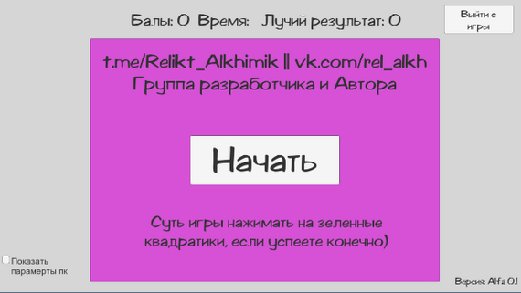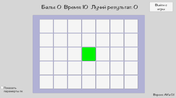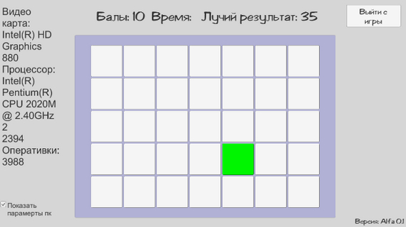 За каждый нажатый белый квадрат получаете мы теряем время и очки, за каждый зеленый что поймали плюс очки и время. Так же плюс бонус, основные характеристики пк, по одному нажатия кнопки.