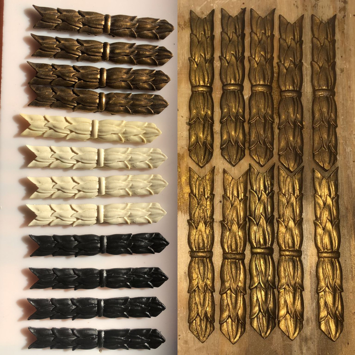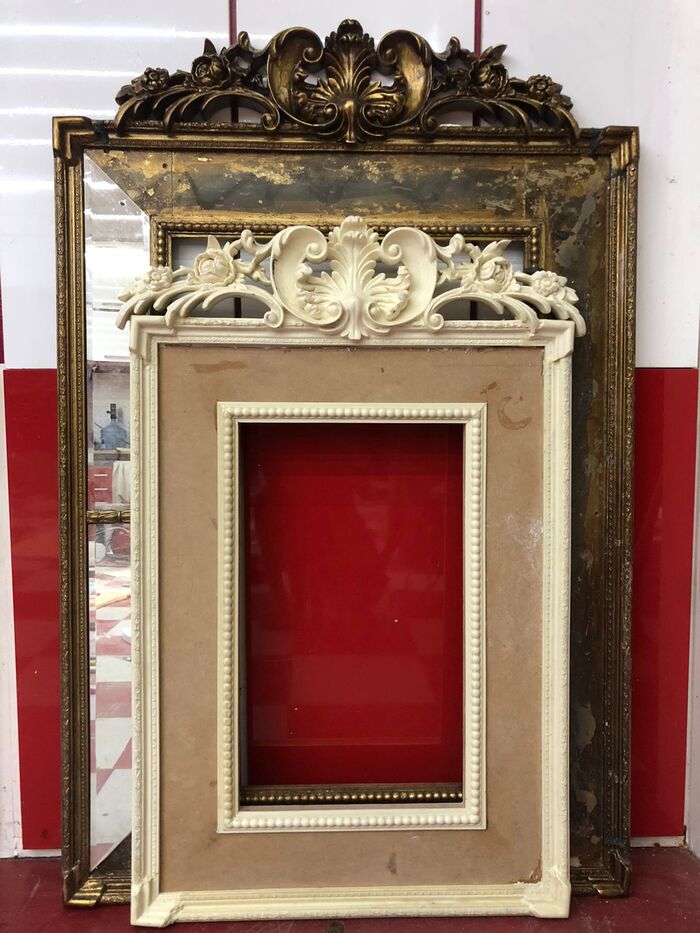 Поступил заказ на реставрацию старого зеркального панно и изготовление из него двух копий меньшего размера. Со старого зеркала мы сняли силиконовые матрицы каждого сегмента для последующей отливки литьевым пластиком. После того, как были отлиты все сегменты, мы их приклеили на готовое основание. Далее все было загрунтовано и окрашено в черный цвет с позолотой, после чего оставалось лишь приклеить зеркала и прикрутить петли для монтажа.