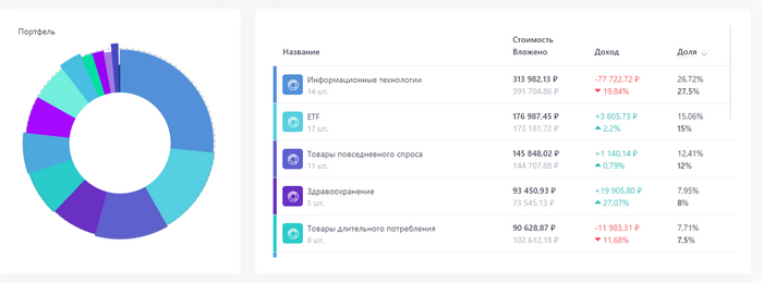 Так как изначально инструменты я покупал хаотично, то структура портфеля выглядит неоднородно. В будущем планирую сбалансировать по категориям и по классам активов. Т.к облигаций в портфеле тысяч на 20, не больше.