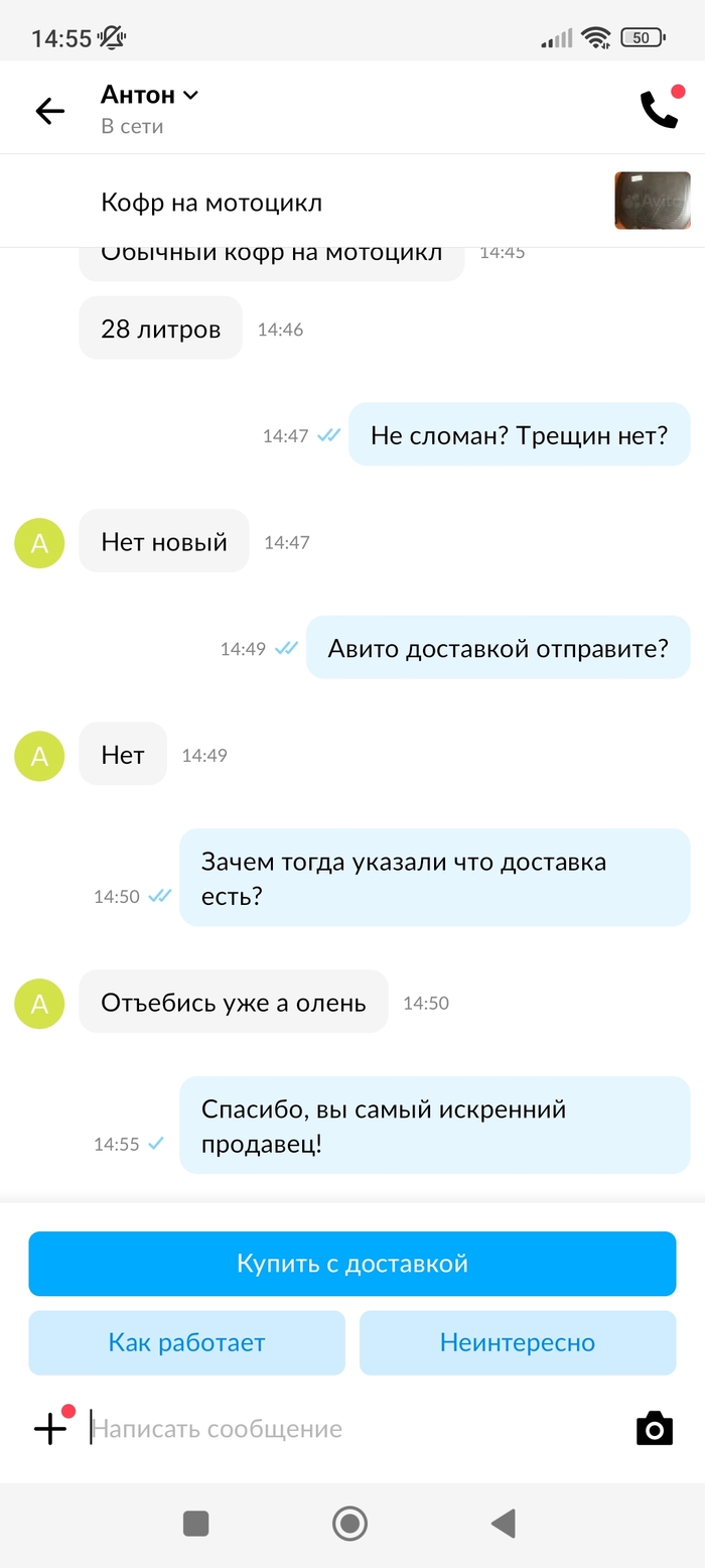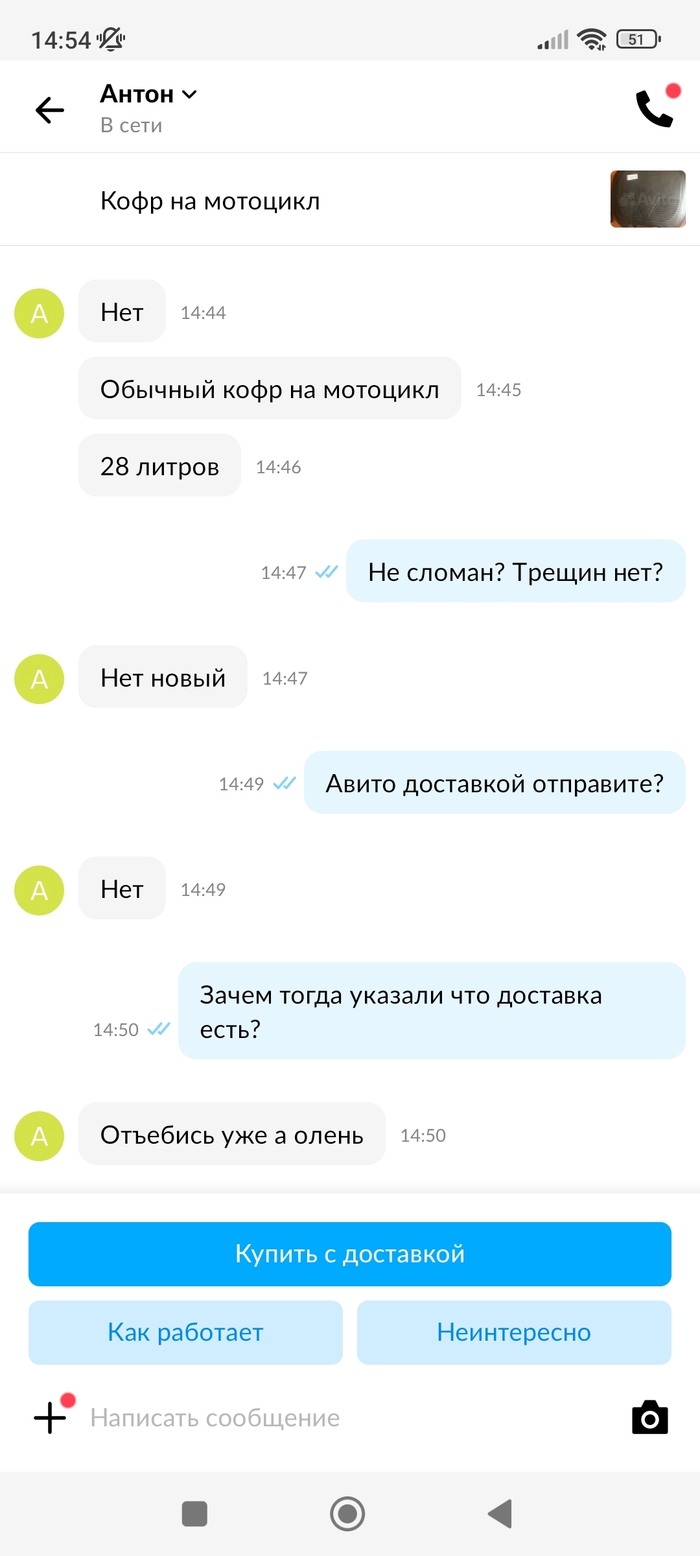 Вот скажите мне пожалуйста, что я сделал не так? Задавал неудобные вопросы? Просто захотел уточнить зачем указали что есть доставка, может я помочь хотел отключить ее, чтобы другие не беспокоили, или человек совсем не знает как это работает и даже не понимает о чем речь. Я когда выбирал данный товар, специально поставил фильтр поиска с доставкой, но мой вопрос слишком задел продавца, на что он мне ответил что я олень.