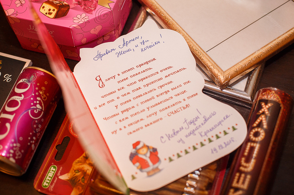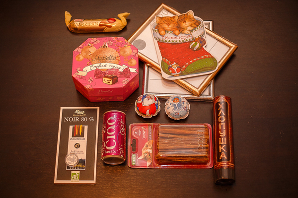 В итоге посылка состояла из коробки конфет, замечательного тёмного шоколада, марципанового батончика, загадочного жемчужного игристого вина, подарочных Сочинских 25-рублёвки и 100-рублёвки, ароматной пены для ванны, хлопушки, двух рамок для фото, котейкиных лакомств и поздравительной открытки.