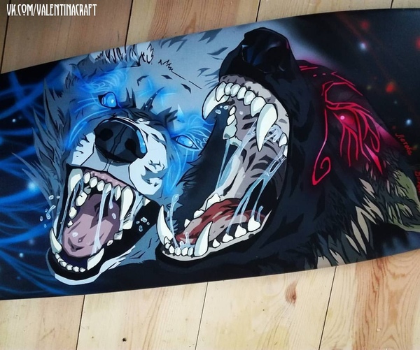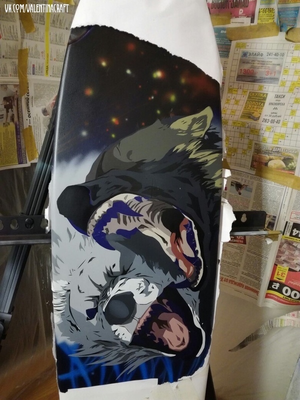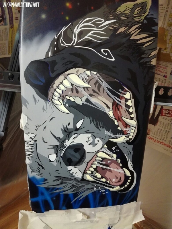 Самое ответственное - покраска. Мне очень нравится красить крафт с помощью аэрографа: никаким баллончиком или кистью не добиться тех плавных переходов и сочетания цветов, которые дает аэрография. Поэтому я выбираю цвета и наношу окрас на маску, тщательно прорабатываю рога Затем покрываю окрашенную конструкцию лаком, для защиты от пыли и более насыщенного блеска. (на этой картинке рог еще не покрыт лаком).