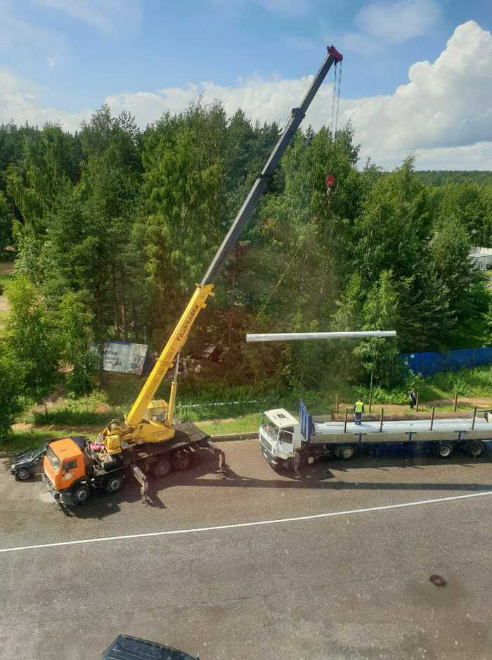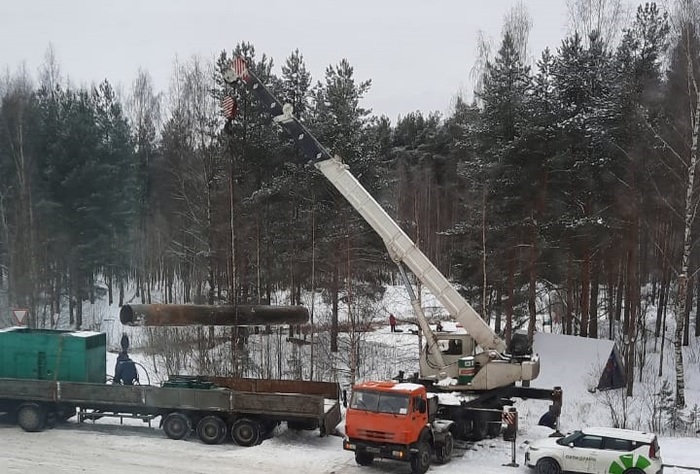 Приехал кран, шаланда с трубами, начали разгрузку.