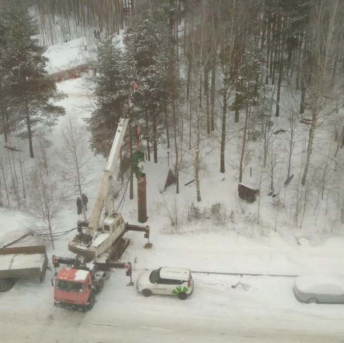 Разгрузили блестящие трубы, одну ржавую, которую быстренько вдавили гидромашиной и уехали. После них осталось такое вот аккуратное колечко. Ну, прямо уличный мангальчик, как в Финляндии подумали мы ))