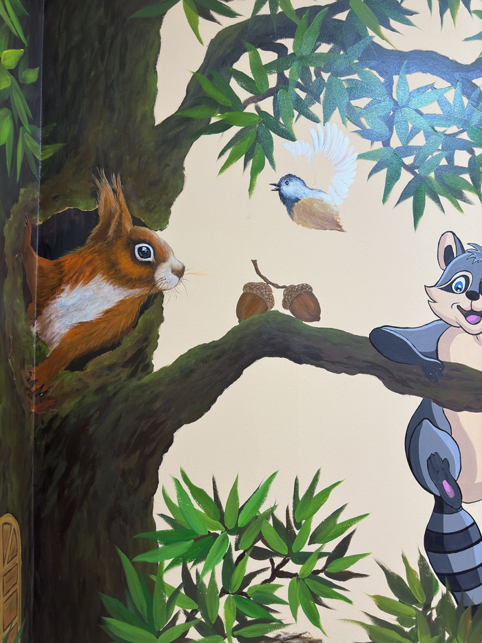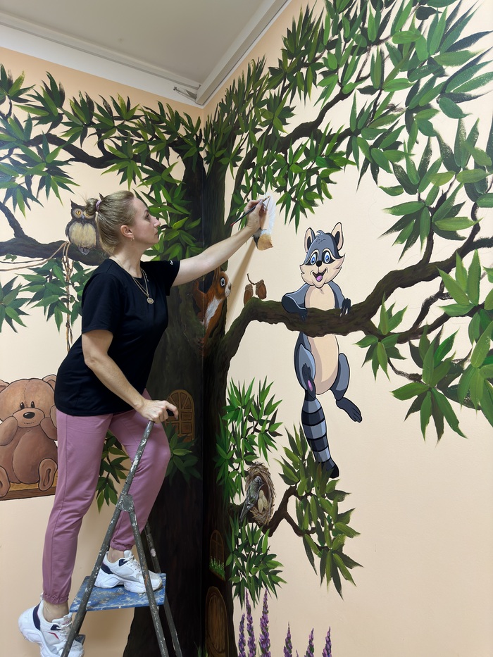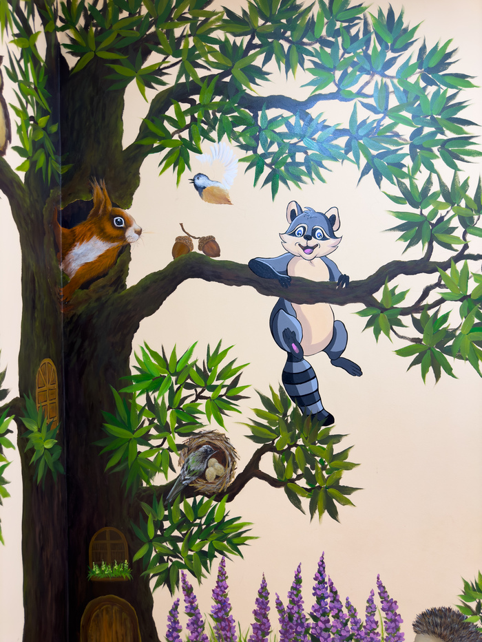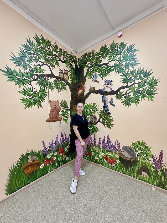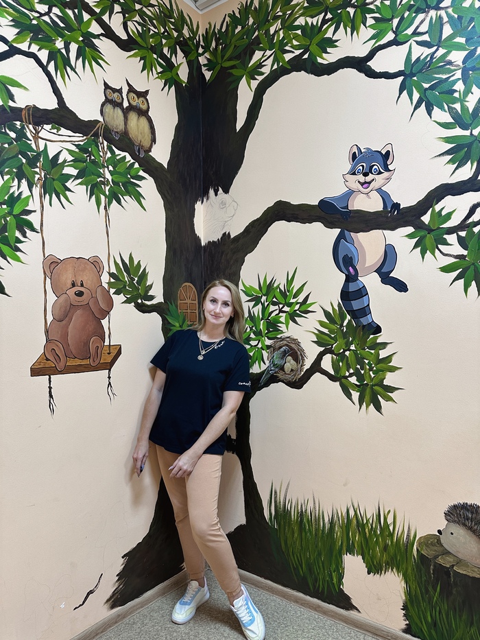 Пригласили расписать детский уголок в городской стоматологии. Пожелания были просты «Вот вам стена, нарисуйте что-нибудь яркое, ну там дерево какое-нибудь, может, еще что. На ваше усмотрение».
