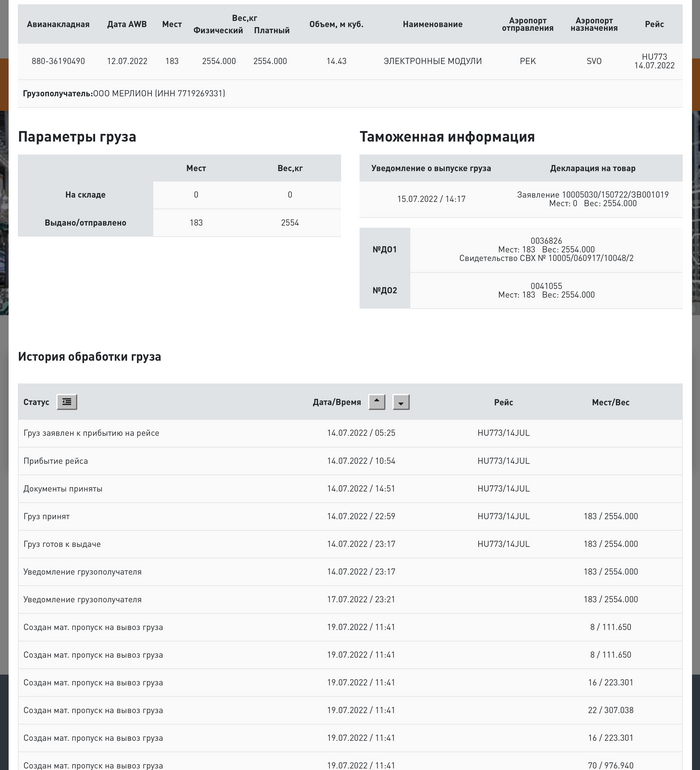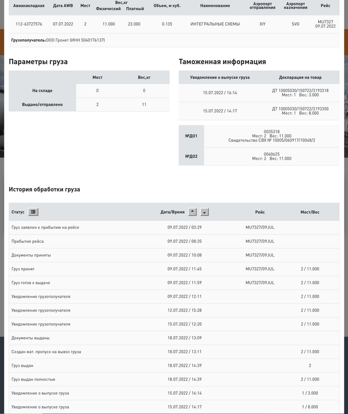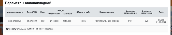 Но на этом странности не заканчиваются. Прилетевший 21 июля груз по документам выдан клиенту полностью… Аж 26 июля! Столько проторчать на авиатерминале - это сильно. Или может, в России переизбыток всего, что можно назвать «интегральными схемами», вот и не спешили забирать?