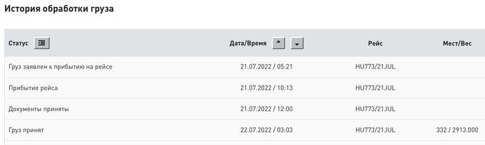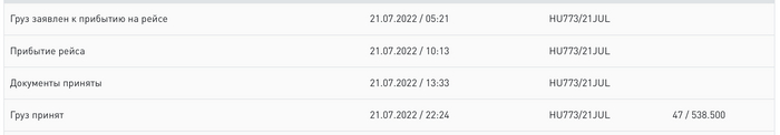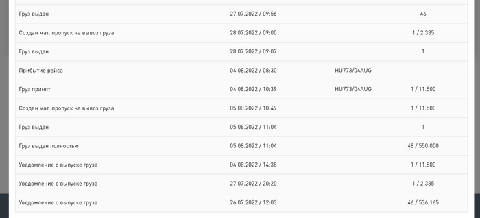 Прилетевший 21 июля груз выдали частично 28 июля, потом аж 4 августа прилетел еще один «Хайнянь» с этим же самым грузом, его довыдавали уже 5 августа… Нормальные сроки для авиации, да?