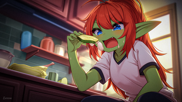 Всё это время я отнекивался от подобного рода контента, понимая, что это - путь без возврата. Генерить такое... но, как видно, спрос на это есть, поэтому пришлось переступить через себя и свою гордость. @bromzar, @NWhisper, вот то, что вы хотели - гоблинша употребляет кабачок внутрь. Ну и добавил немного cream. Жду своих миллиардов, кстати. Надеюсь, вам стыдно за это. Ещё и бонус в комментах будет, фу.