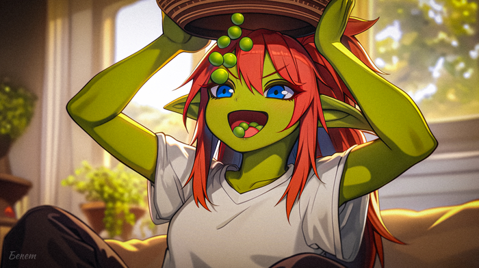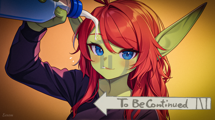 Уф. Проорался, полегче стало. Короче. Я говорил, что это скользкий путь? Так вот, я поскользнулся. Назад дороги нет, во мне проснулась алчность. Раз вы хотите пихать в гоблинш всякое - будем пихать в гоблинш всякое. Может, вам ещё и называть такие картинки похабно? "Рыжая гоблинша была поймана за пиханием в себя BBS (Big Bold Sausage)? Нравится? Ну смотрите)