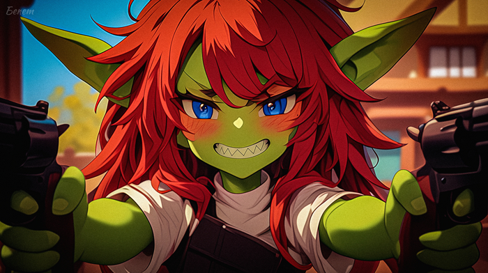 Всё, шутки кончились. Гоблинша направляет на тебя свой большой, чёрный ствол.