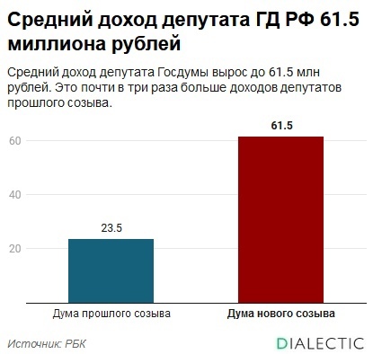Однако нужно учитывать, что средние показатели в новой Думе заметно выросли за счет состоятельных новичков. К примеру, список парламентариев с наибольшим доходом возглавляют владелец ООО «Инфамед К» — предприятия, производящего «Мирамистин», — Андрей Горохов (задекларировал 7,5 млрд руб. годового дохода и 11,2 млрд руб. на счетах, на сегодня его доход — самый высокий среди всех парламентариев), основатель Faberlic Алексей Нечаев (4,4 млрд руб. дохода и 1 млрд руб. на счете) и основатель мясоперерабатывающей компании ABI Group Григорий Аникеев (2,7 млрд руб. дохода, 3,2 млрд руб. на счетах, до последнего времени он был депутатом с самыми большими доходами).