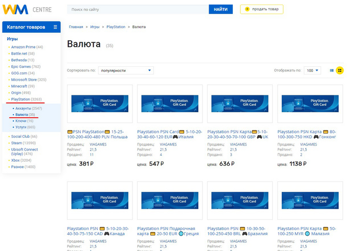 - Переходим на wmcentre.net. Слева на первой странице находим раздел «PlayStation» - «Валюта»