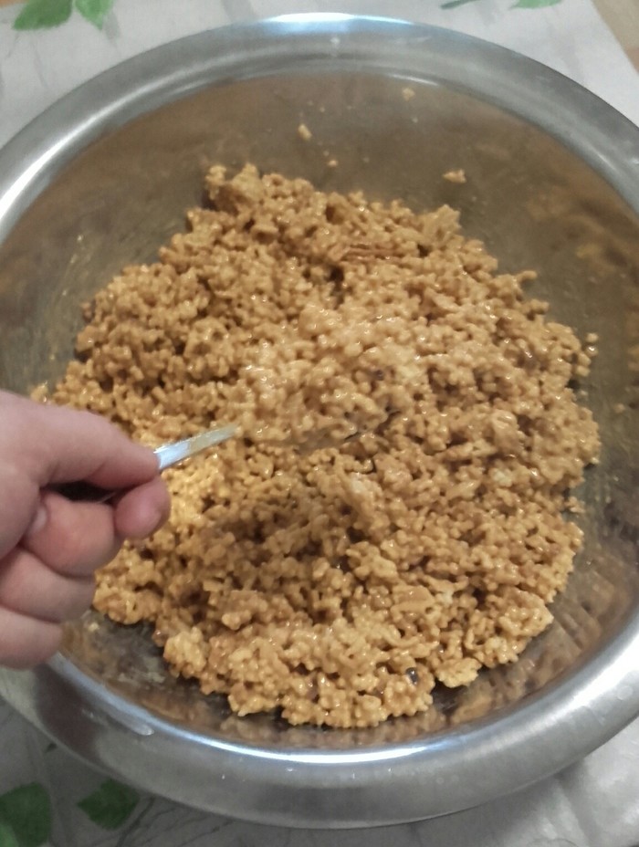 Дальше можно пойти двумя путями: ждать пока песочное тесто остынет и потом смешивать с кремом. Я смешиваю ещё горячее печенье, мне кажется что так масло и сгуха тают и лучше пропитывают печенье. Но это только мое субъективное мнение, на него , в принципе, можно положить хуй. Это законно.