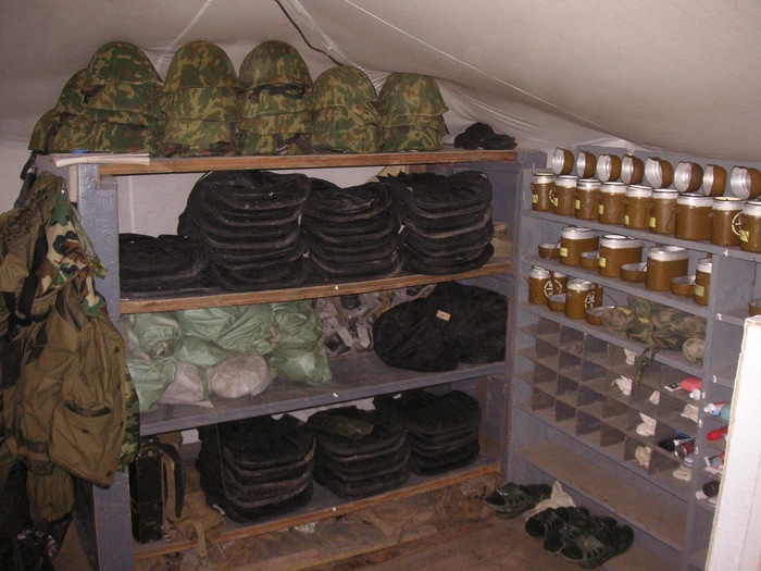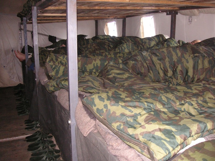 не имею понятия как вообще в войсках, но у нас было положено, заходя в палатку, снимать берцы при входе и ставить их в обувницу, одевая на ноги тапки. Еще и полы в палатке мыли. Если вспомнить рассказы про грязь, можно представить что обувь представляла из себя просто комок грязи. Оставлять грязь на ботинках тоже нельзя. высохнет-заебешься отколачивать. Да и не эстетично. Таким образом, обувь всегда приходилось мыть. Вот прямо, блять, мыть. Пришел с караула-берешь ебанный тазик, палку-ковырялку, щетку. И пидорасишь берцы. И так весь взвод. У остальных не особо за этим следили. Было или похуй, или офицеры понимали, что солдаты, да и они сами заебаны в корягу и не до этого. Вырубались же все прямо на ходу. Ну вот такой у нас был взводный))) В палатке было более-менее тепло. Спальники были обычные ватные с флисовой подкладкой. Но очень теплые. Спали вповалку на шконках, подложив под себя свои же матрасы и одеяла, которые захватили с собой ранее.