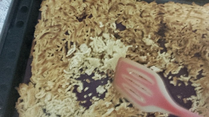 В сотейник 400 гр сливочного масла. Растапливаем на медленном огне. Как растопится, смешиваем при помощи миксера со стаканом сахара, чайной ложкой соды и щепоткой соли. После этого, насыпаем туда же пшеничную муку. Можно не жалеть, тесто должно получиться крутым. Как будет готово тесто, проворачиваем его на противень через мясорубку, либо замораживаем и трем на тёрке. Первый вариант быстрее, естественно. Выпекаем до готовности. Готовность проверяется пробой. В общем, когда будет золотистого цвета, значит, точно готово. Мы делали так: сначала минут 15 запекаем, как позолотится, крошим и перемешиваем, и снова в духовку. Но это потому, что духовка уебищная, у вас может быть и сразу будет готово.