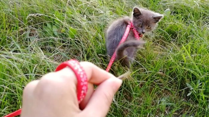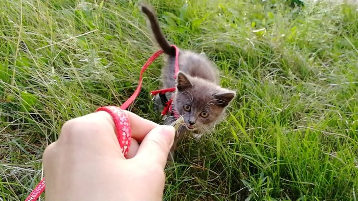 Итак, в пятницу было принято решение везти Семечку к ветеринару в субботу в соседний город (ибо у нас ветеринар работает только по будням). На улице было достаточно тепло, поэтому мы с Сёмой решили прогуляться, дабы погреться на солнышке и потыкать лапкой в кузнечиков. Прогулка пошла коту на пользу и он не только согрелся, но даже оживился и начал бегать за кузнечиками и прыгать по ступенькам (до этого он был очень вялый и только спал). Соседи офигевали с кота на шлейке, дети умилялись, собаки смотрели непонимающе издалека. Зайдя домой после прогулки, кот с протяжным "Мяяяяяяяя" побежал к миске, что не могло нас не радовать. И на удивление, кот с аппетитом уплел пюре из индейки ("Агуша" с индейкой ему понравилась больше, нежели "Тема" с кроликом) целых две ложечки (десертные). После кот стал сыт и доволен собой и занялся прихорашиванием своего внешнего вида, и даже поиграл с нами.