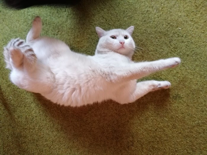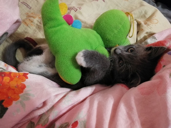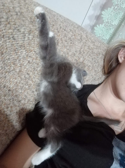 Кот освоился и живёт счастливой жизнью, только иногда падает с дивана, когда сильно заиграется.