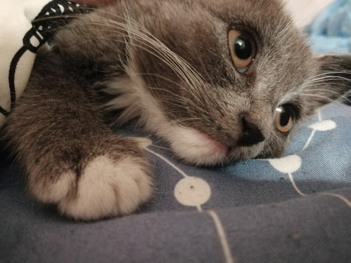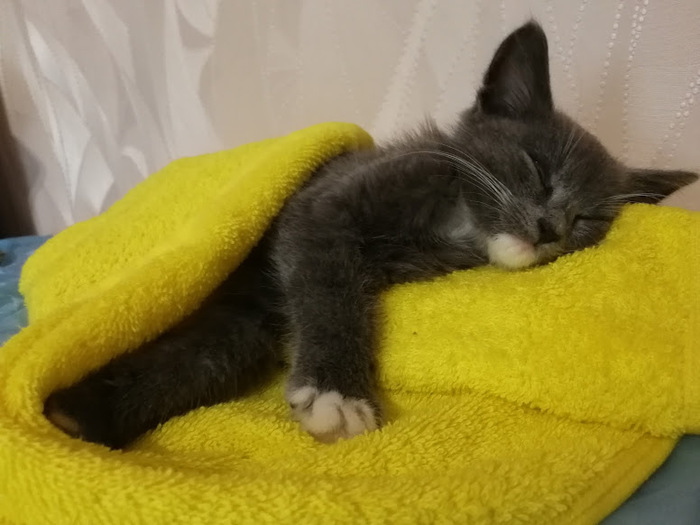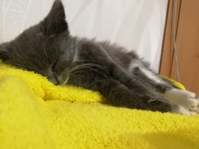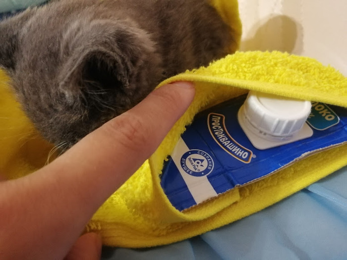 По приходу домой Сёмик был напоен смектой и сам изъявил желание попить водички, на бульон посмотрел косо и с отвращением, но через пол часа был все же накормлен бульоном через шприц. Помыв мордочку, залез на ручки и заснул, мной же начал писаться этот пост. Через 40 минут проснулся голод и мы все пошли обедать. Сёмка уже с удовольствием уплетал отварное и мелко нарезанное мясо, и даже попросил добавки. Еще, сделали ему грелку из коробки молока, налив в нее теплую водичку, чтобы ему было комфортно спать без кого-либо. Сейчас он спит и набирается сил. В планах проставить весь курс уколов и соблюдать диету, а после вырасти в огромного и пушистого кота, и тогда уже величаво быть Семеном.