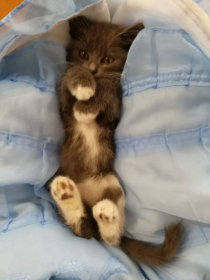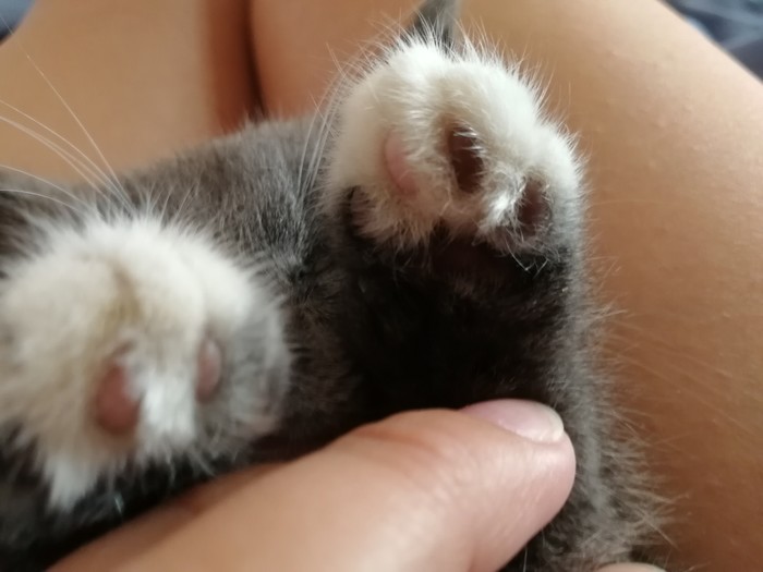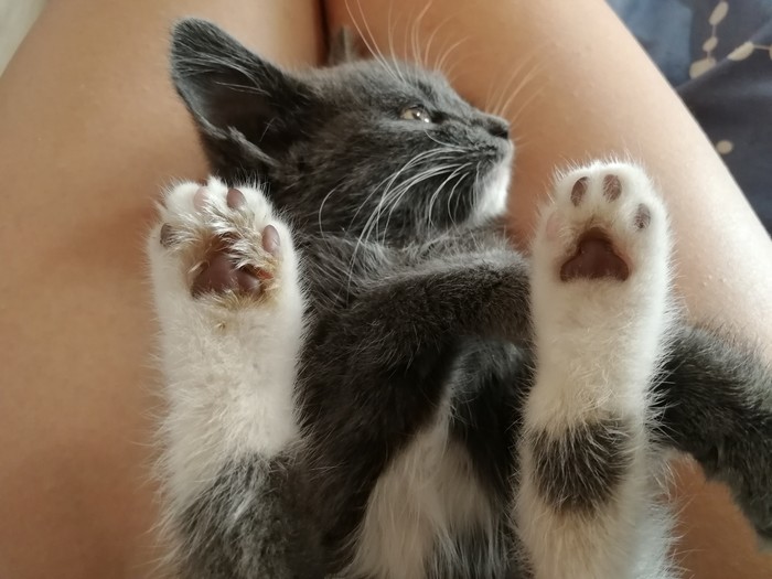 У него уже есть все, что нужно котёнку для счастья, ну наверное, только за исключением когтеточки. Почти две недели назад, в воскресенье, поздно вечером, возвращаясь домой услышали в темноте жалобное мяуконье и пошли на звук. Там сидел он, напуганный и дрожащий от холода, страха и голода. И тут и было принято решение, что теперь у нас будет кот. Хотя до этого в планах завести кто-нибудь было только после нг. Но видимо, с кошками все не так, и вообще они сами тебя находят, и говорят, мол "все, теперь ты мой хозяин, неси меня домой, корми и люби".